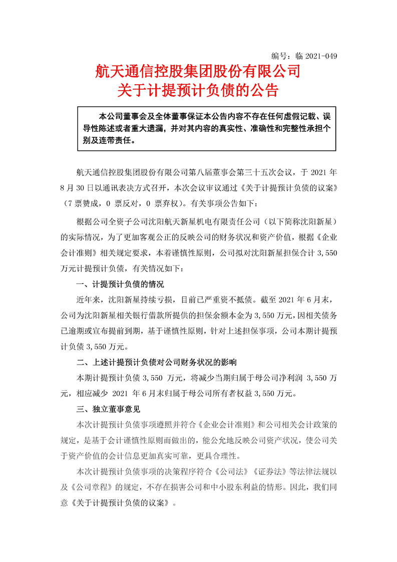 航天通信控股集團股份有限公司關于計提預計負債的公告