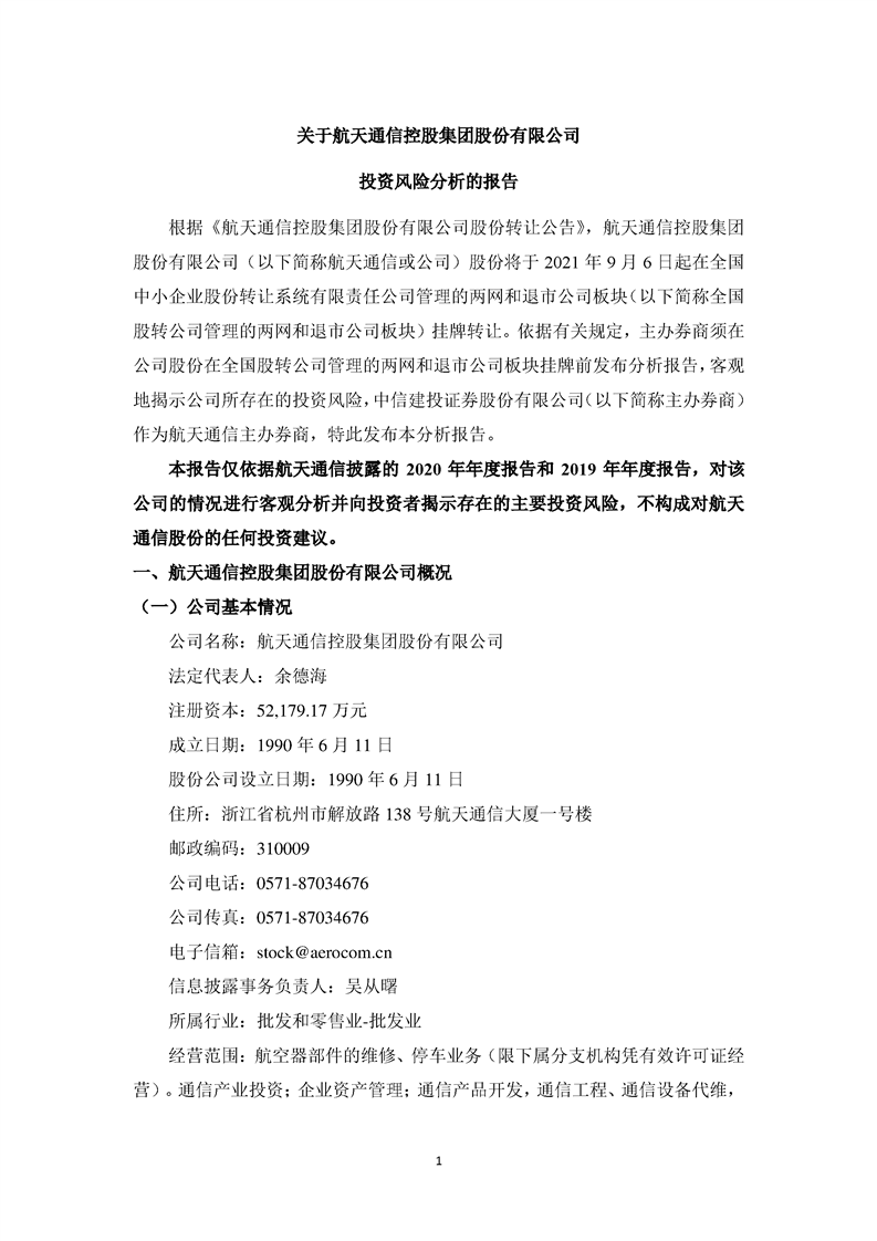 關于航天通信控股集團股份有限公司投資風險分析的報告